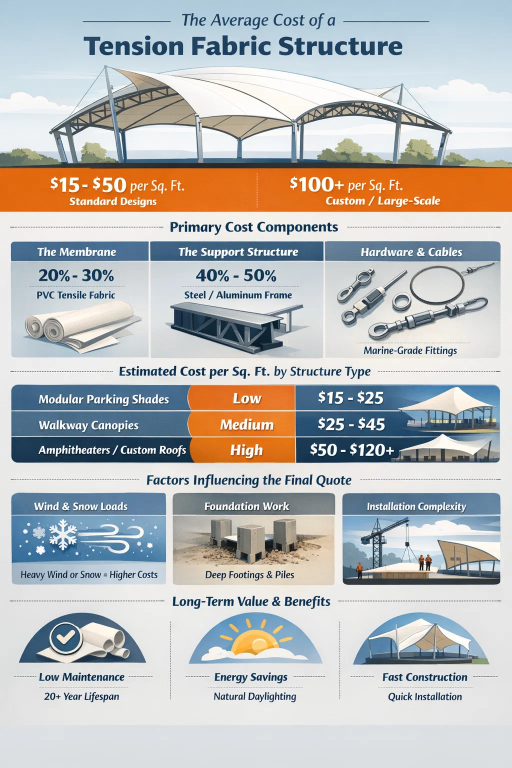 Die Kosten für eine Spanngewebestruktur liegen typischerweise zwischen 15 bis 50 US-Dollar pro Quadratfuß für Standarddesigns, während hochgradig individuelle oder groß angelegte Architekturprojekte darüber hinausgehen können 100 $ pro Quadratfuß . Dieser Preis gilt nicht nur für die PVC-Zuggewebe selbst; Es umfasst ein komplettes System, einschließlich des technischen Stahlgerüsts, spezieller Hardware, Fundamentarbeiten und fachmännischer Installationsarbeit. Da diese Konstruktionen maßgeschneidert sind, um bestimmten Wind- und Schneelasten standzuhalten, schwanken die Preise je nach geografischer Lage und Designkomplexität.