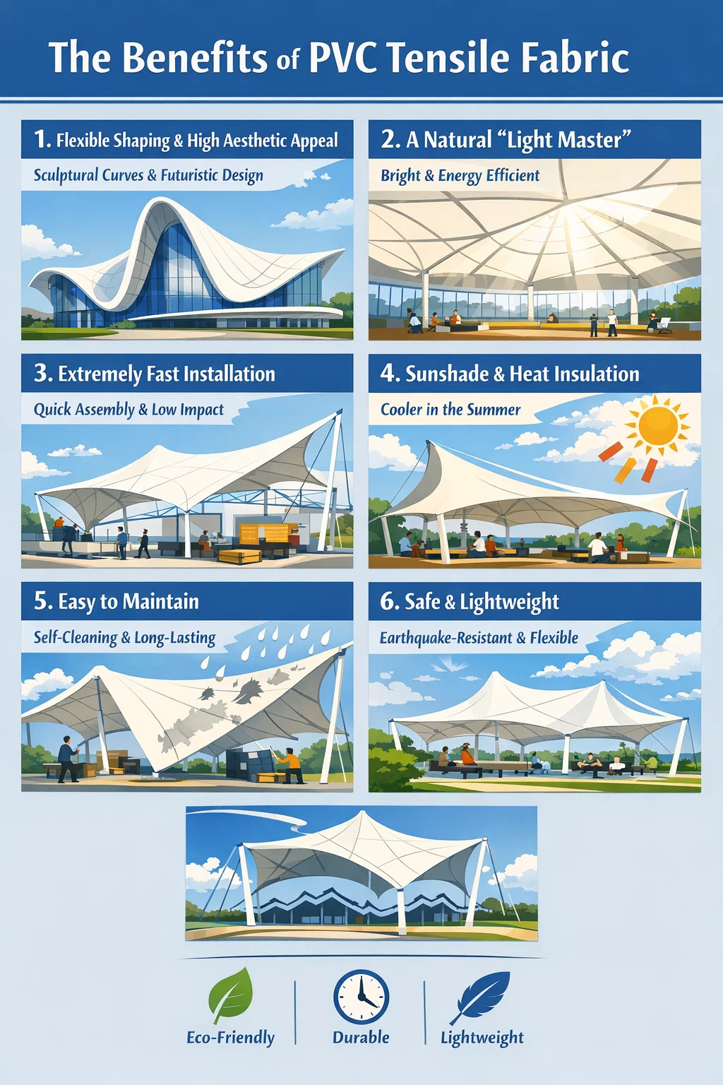 Apropos Vorteile von PVC-Zuggewebe Seine Beliebtheit in der modernen Architektur, insbesondere in Stadien, auf Plätzen im Freien und bei der Beschattung von Landschaften, beruht auf seinen vielen einzigartigen Vorteilen gegenüber herkömmlichen Materialien.