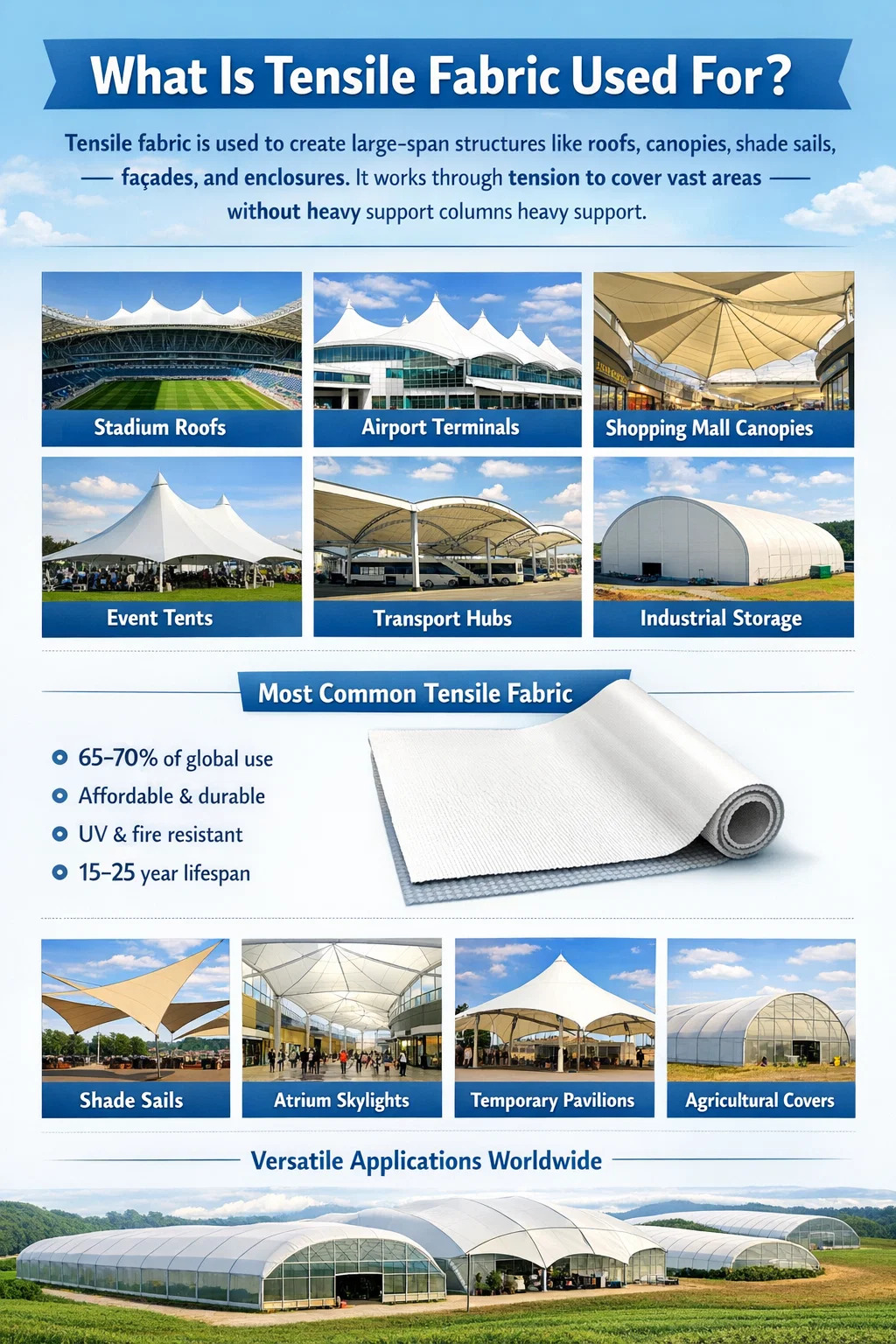 | PVC-beschichtetes Polyester | Polyestergarn | 15–25 Jahre | 15–45 USD | Veranstaltungen, Überdachungen, Stadien, Industrie |