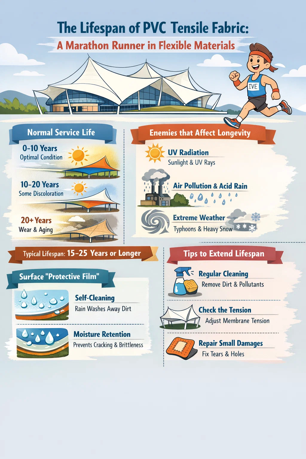 Bezüglich der Lebensdauer von PVC-Zuggewebe Vereinfacht ausgedrückt ist es wie eine High-Tech-„Hülle“, die ein Gebäude über einen längeren Zeitraum begleiten kann. Auch wenn es nicht wie Ziegel und Fliesen hundert Jahre hält, ist es in der Welt der flexiblen Materialien auf jeden Fall ein langlebiger „Marathonläufer“.