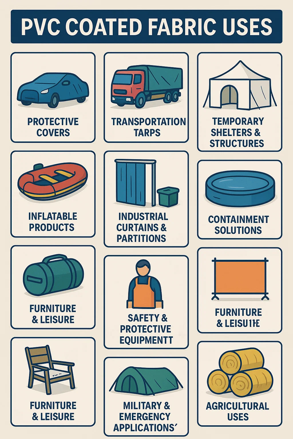 Hier ist eine Aufschlüsselung der häufigsten Verwendungszwecke für PVC-beschichteter Stoff , was seine praktischen Anwendungen widerspiegelt: